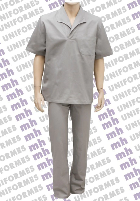 Este conjunto operacional possui duas peças, sendo uma calça com elástico na cintura e uma camisa com gola italiana e mangas curtas.