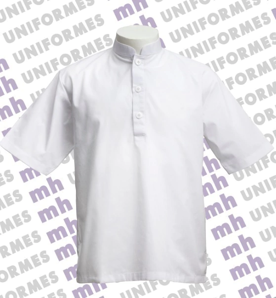 O jaleco com gola padre é especialmente indicado para o uso de funcionários de cozinha e atendentes.