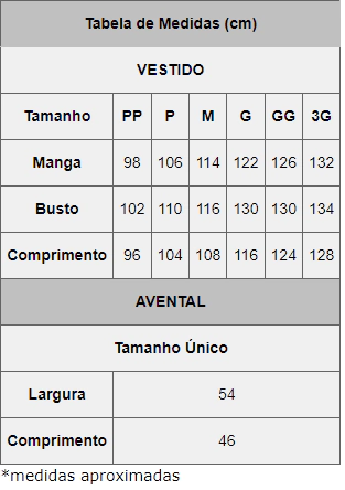 Ele possui detalhes bordados na gola e nas mangas, além de no próprio avental, promovendo um visual mais delicado.